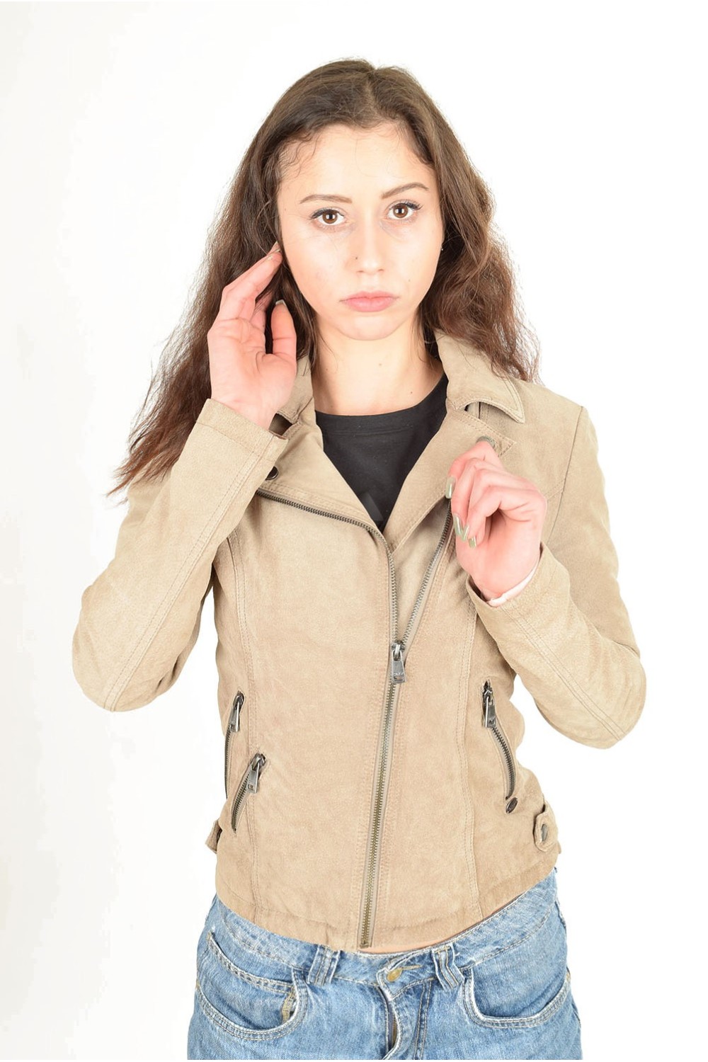 Geacă bej din piele întoarsă din piele naturală